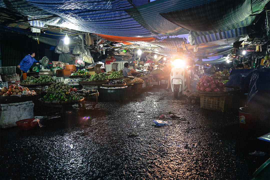 Approaching the northern Delta on the Hau River, I visit a Cham village that lies behind a curtain of mangroves and Nipa palms. Children play on a long rickety jetty, leaping into the river as a warm rain sets in. The Cham people are a Muslim minority and one of the oldest communities to settle in this area. Their homes are set on high stilts, and the ground is slippery clay. This is a town designed to ride out the annual flood season.